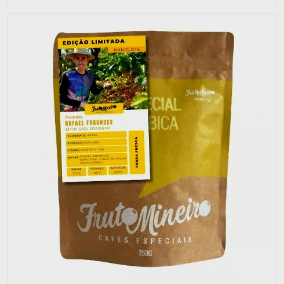 Notas sensoriais de Frutas amarelas; rapadura; curau de milho. Variedade: Arara Processo: Natural Produzido por Rafael Fagundes Fazenda: Sítio São Joaquim Cidade: Natércia - MG