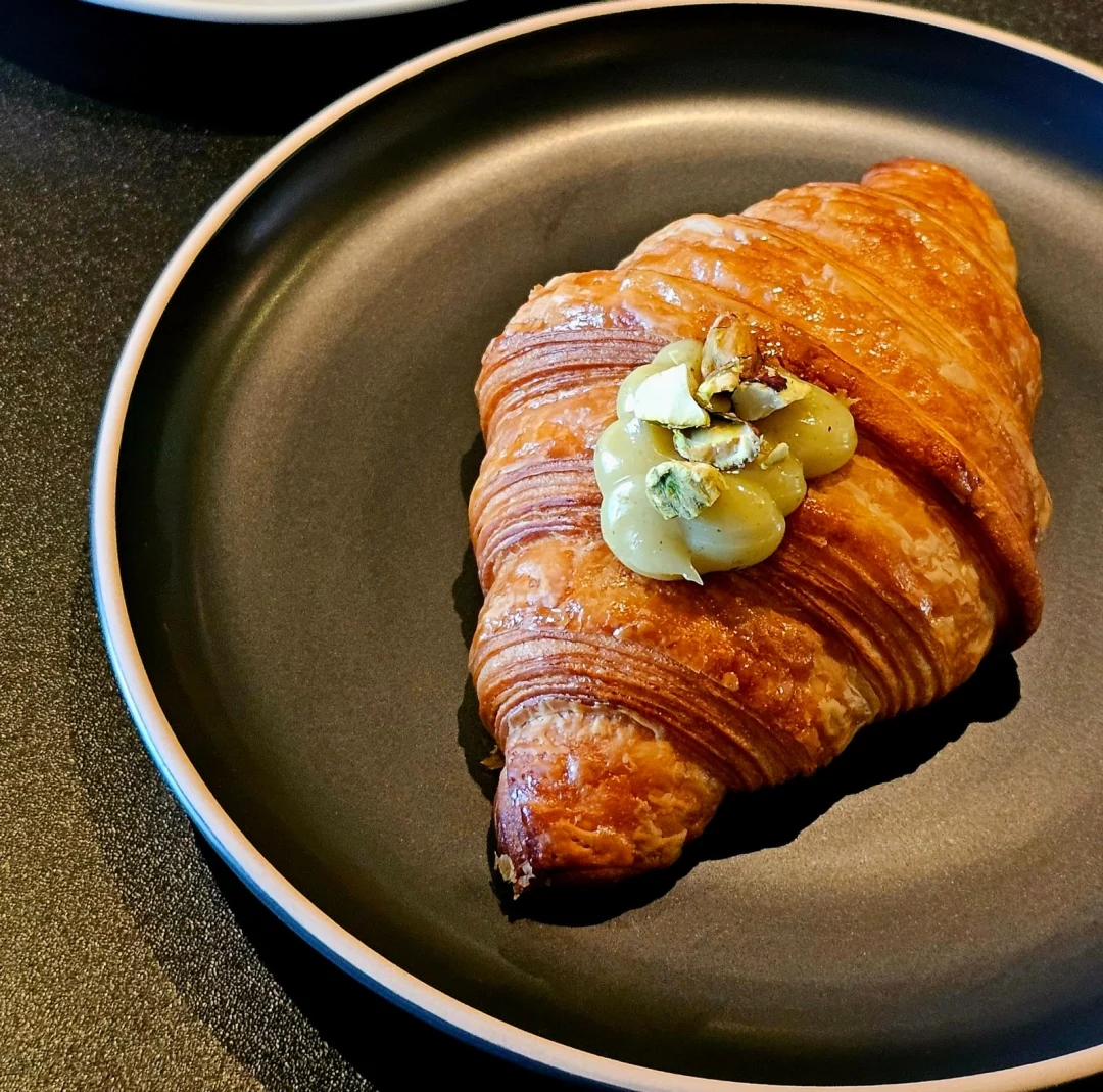 Croissant quentinho, recheado e finalizado com creme de pistache e pistache tostado.